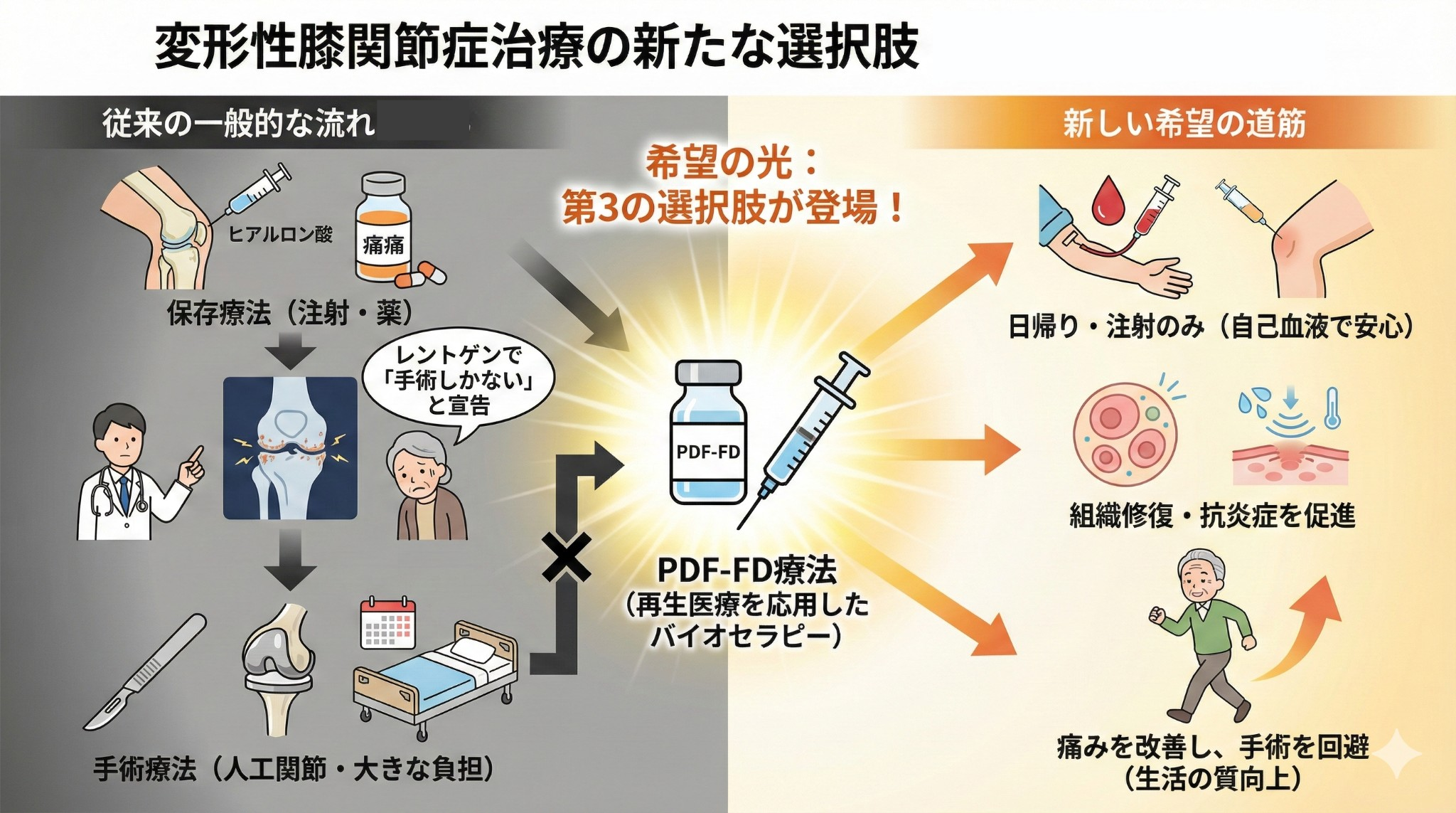 PDF-FD 療法は、患者様ご自身の血液を活用し、関節の痛みや炎症を和らげ、身体の自己修復力を高める治療法です。