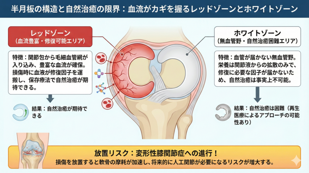 半月板の外縁部、つまり関節包に接する外側約3分の1の領域は「レッドゾーン」と呼ばれています。
