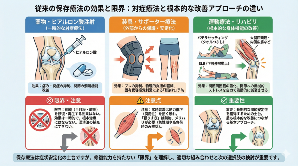 ヒアルロン酸注射やリハビリは痛みの軽減や筋力強化に有効である一方、損傷した半月板そのものを修復する力は持っていません。