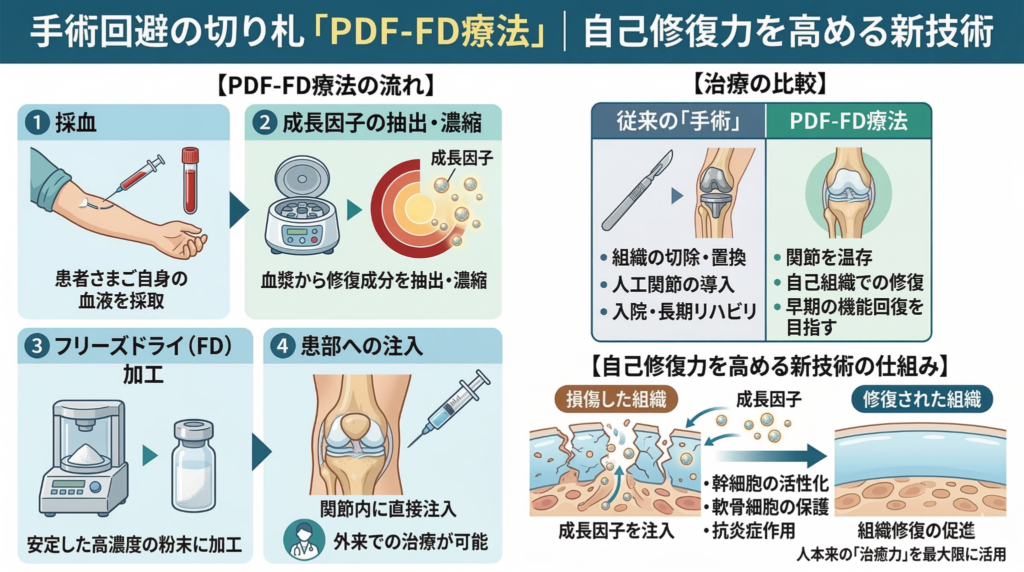そこで注目されているのが、自身の血液から成長因子を高濃度に抽出・凍結乾燥して患部に注入する「PDF-FD療法」です。