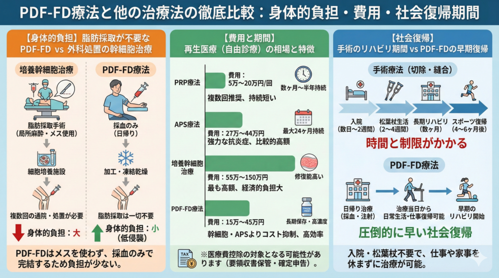 ここでは、各治療法の費用・期間・特徴を比較しながら、PDF-FD療法の優位性を明確にしていきます。