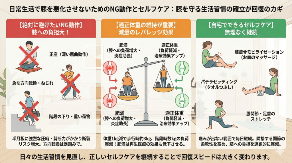 半月板損傷を手術しないで治すためには、患者さんご自身が「膝を守る生活習慣」を確立することが不可欠です。